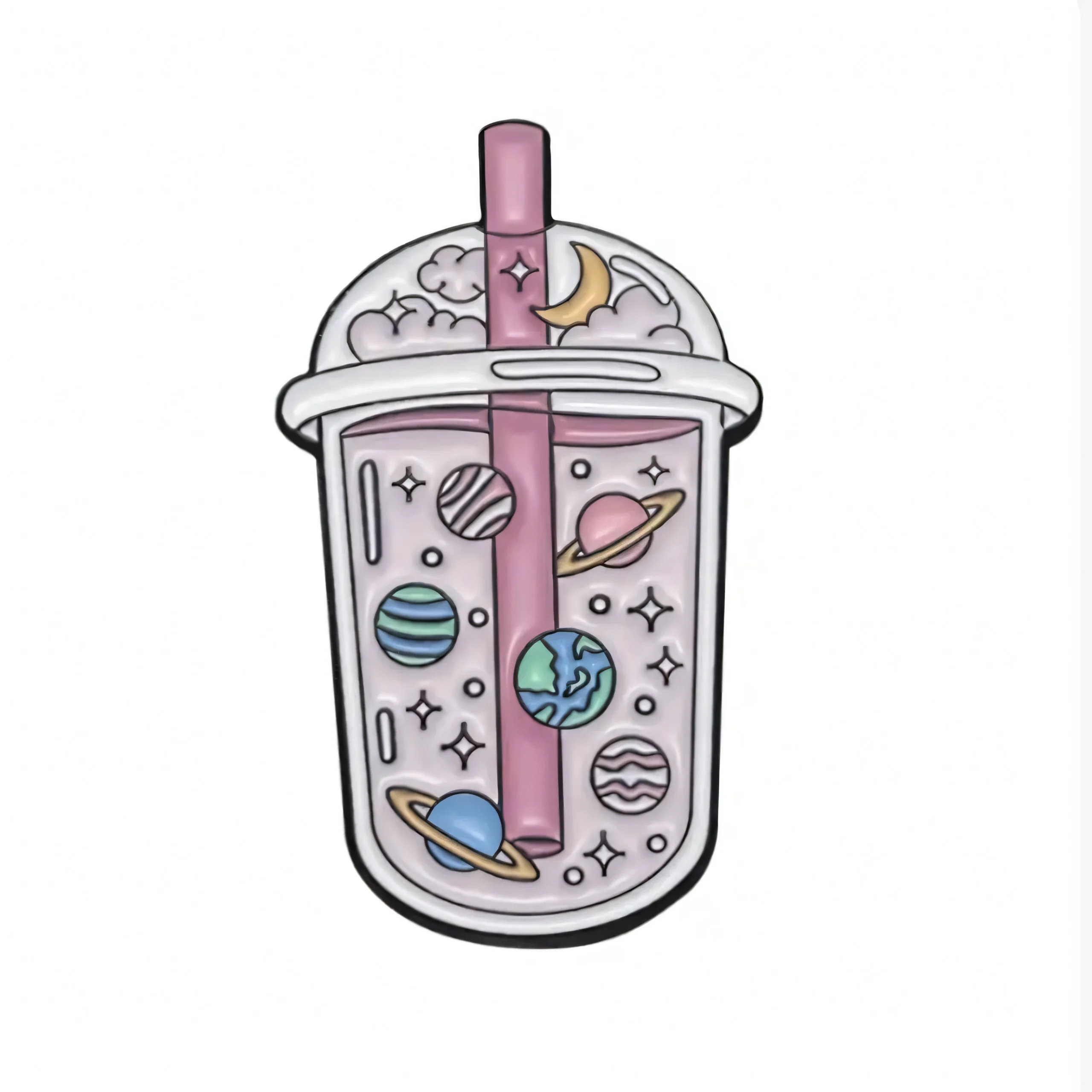 Sip into the cosmos with this enchanting enamel pin featuring a drink cup filled with planets and stars, perfect for any space enthusiast.